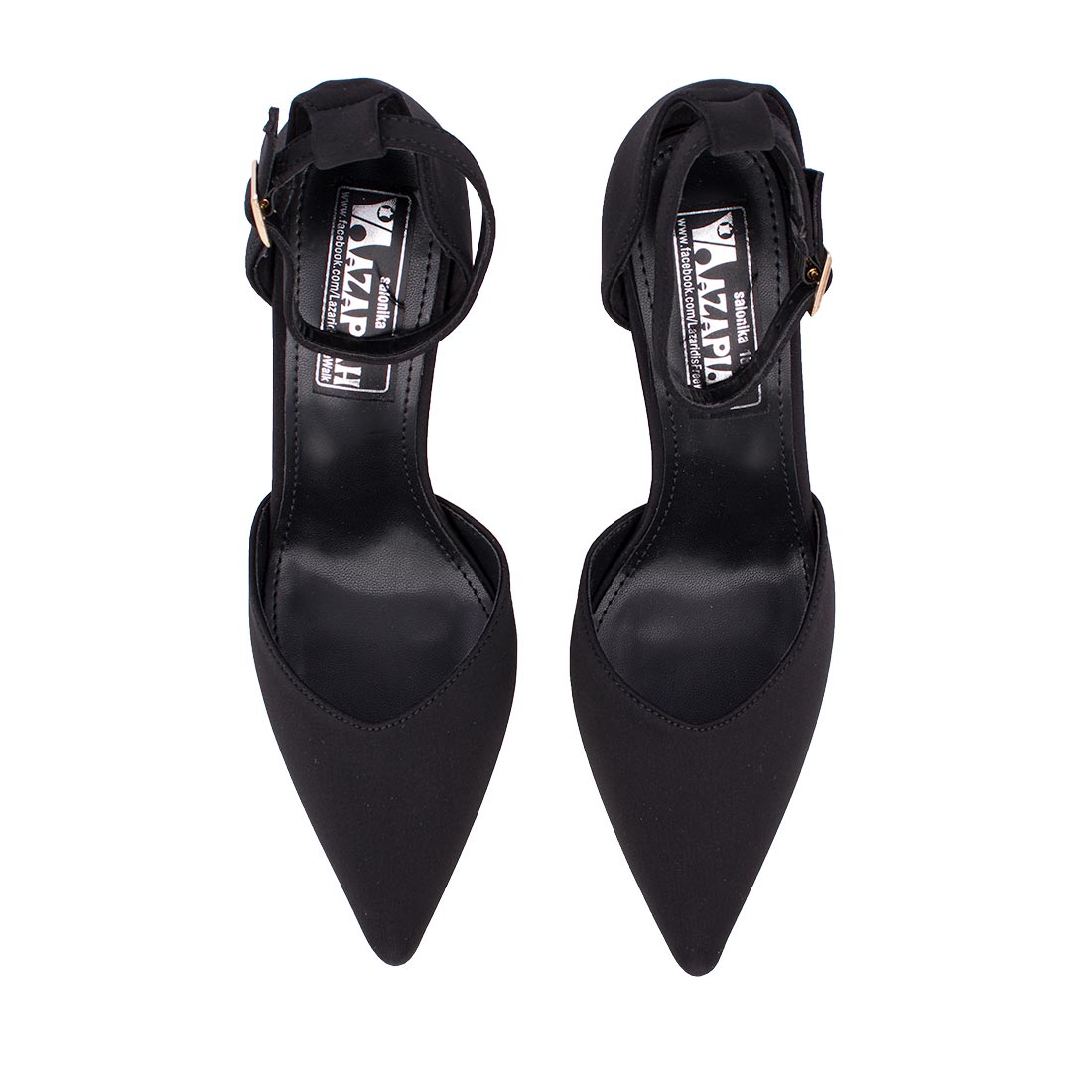 Μυτερή κομψή γόβα σε μαύρο σατέν με λουράκι στον αστράγαλο